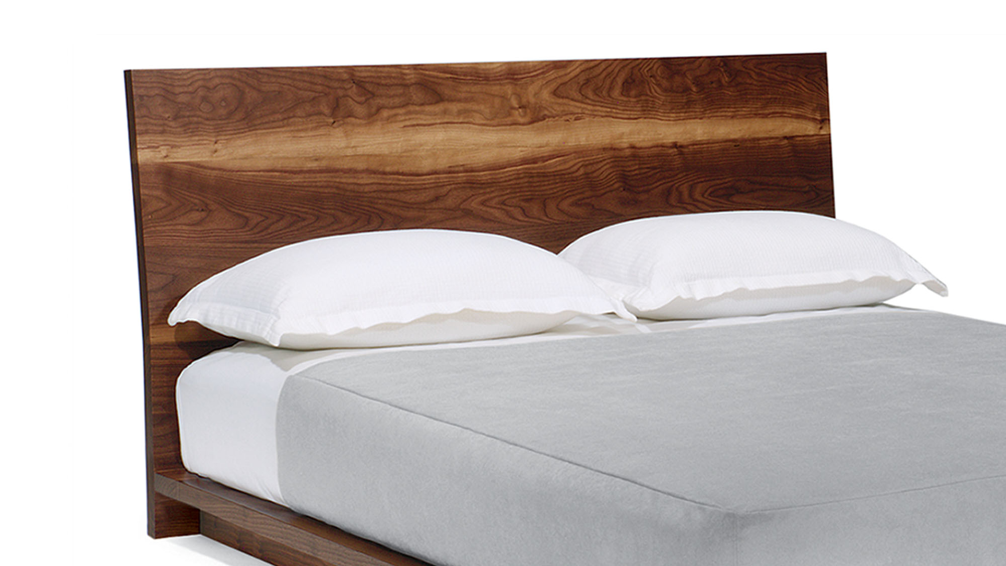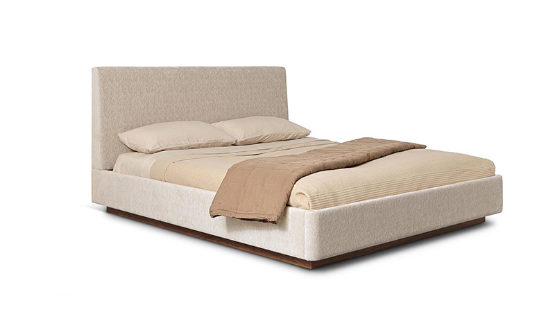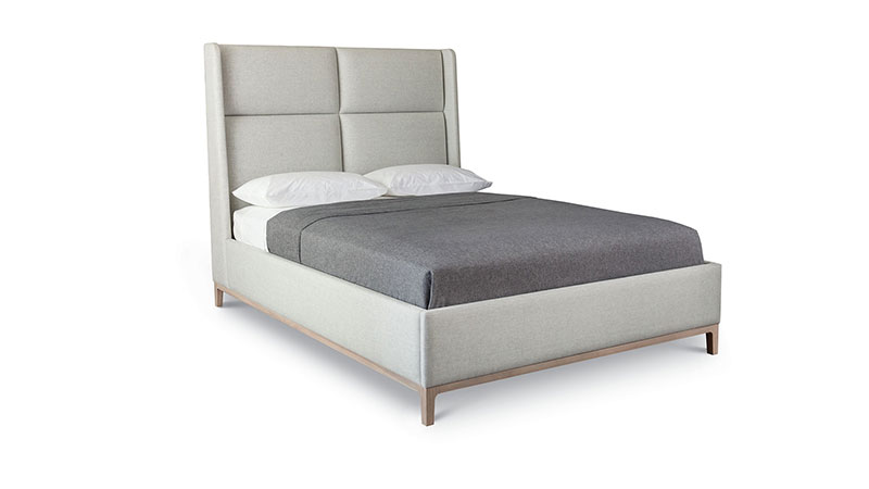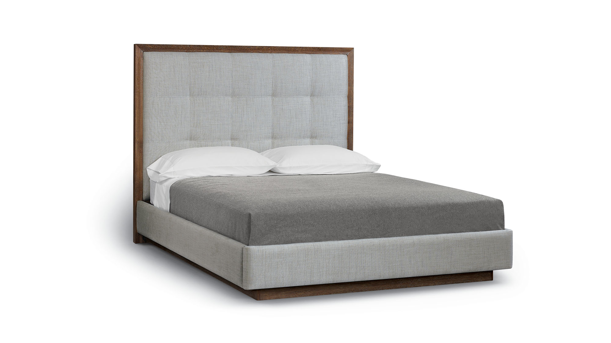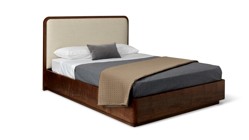 Shown in Cerused Walnut with Upholstered Rails and Headboard
