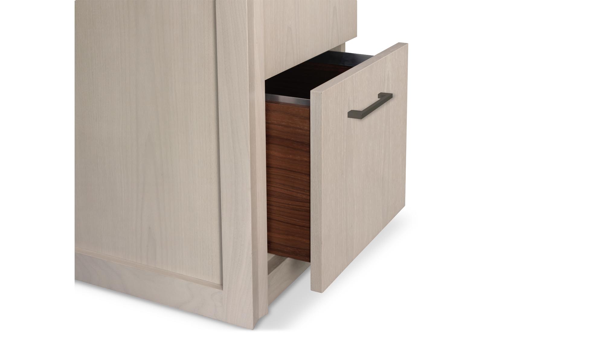 Shown in Medium Walnut. Optional Satin Lacquer fronts with Dark Bronze edge pulls - 48W x 21D x 30H