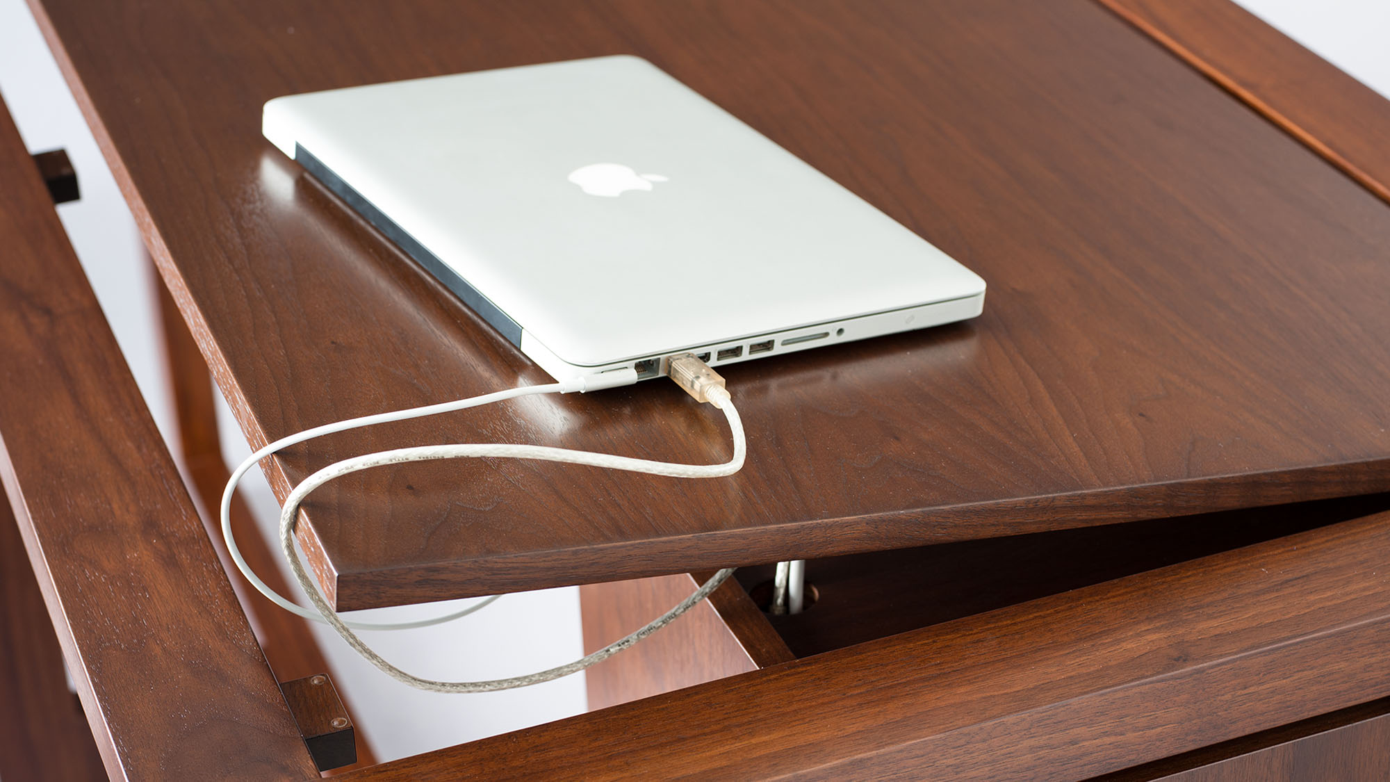 The perimeter reveal around the hinged desk top functions as a wire chase.