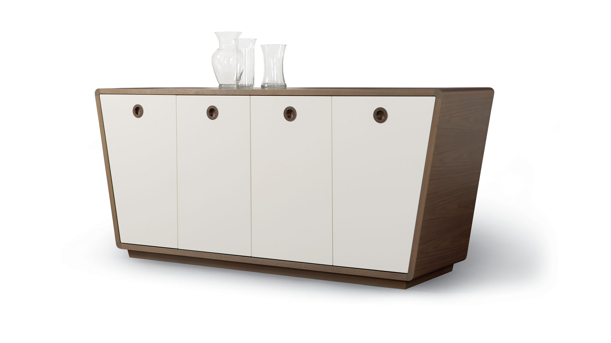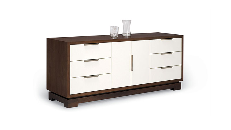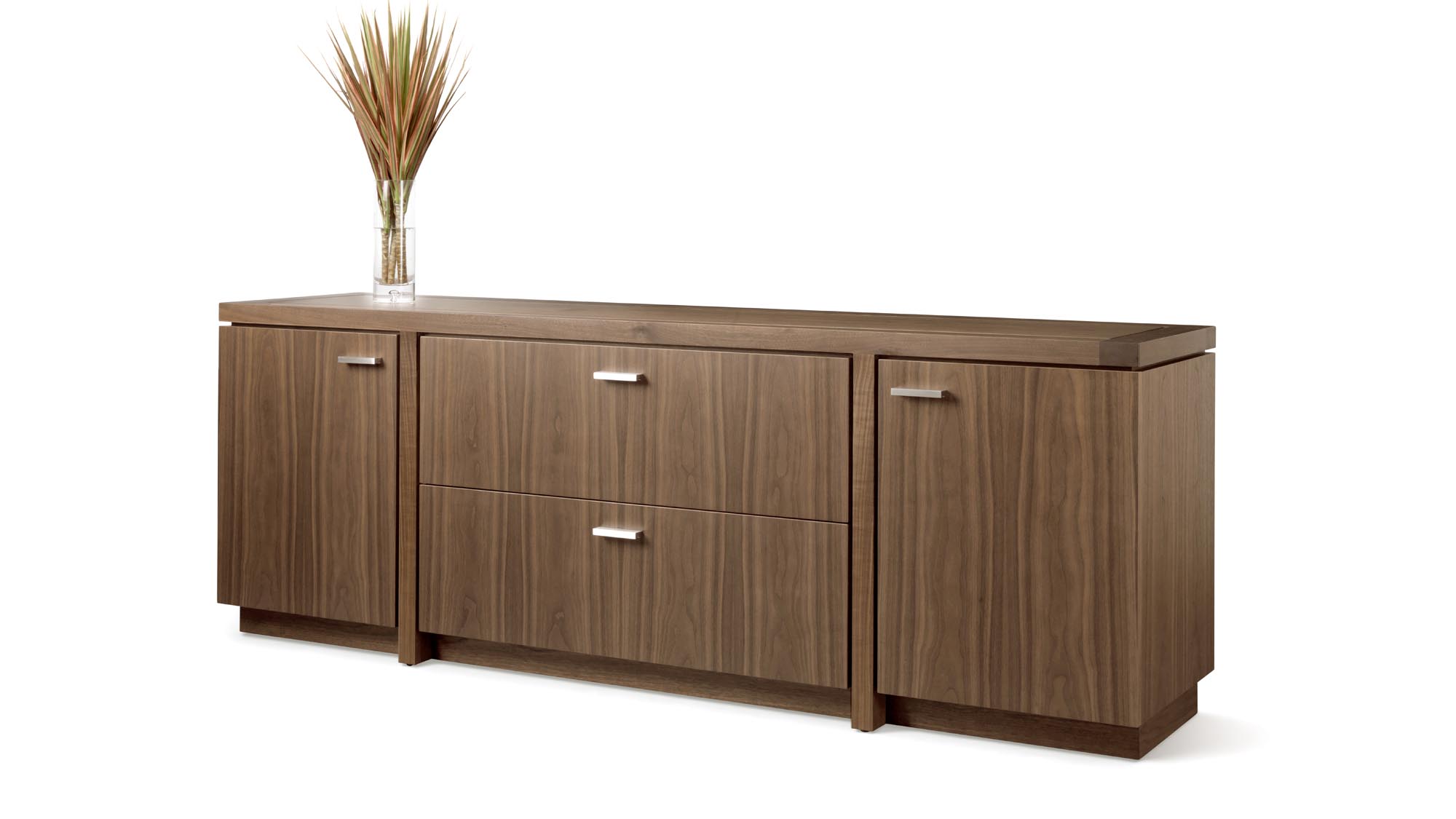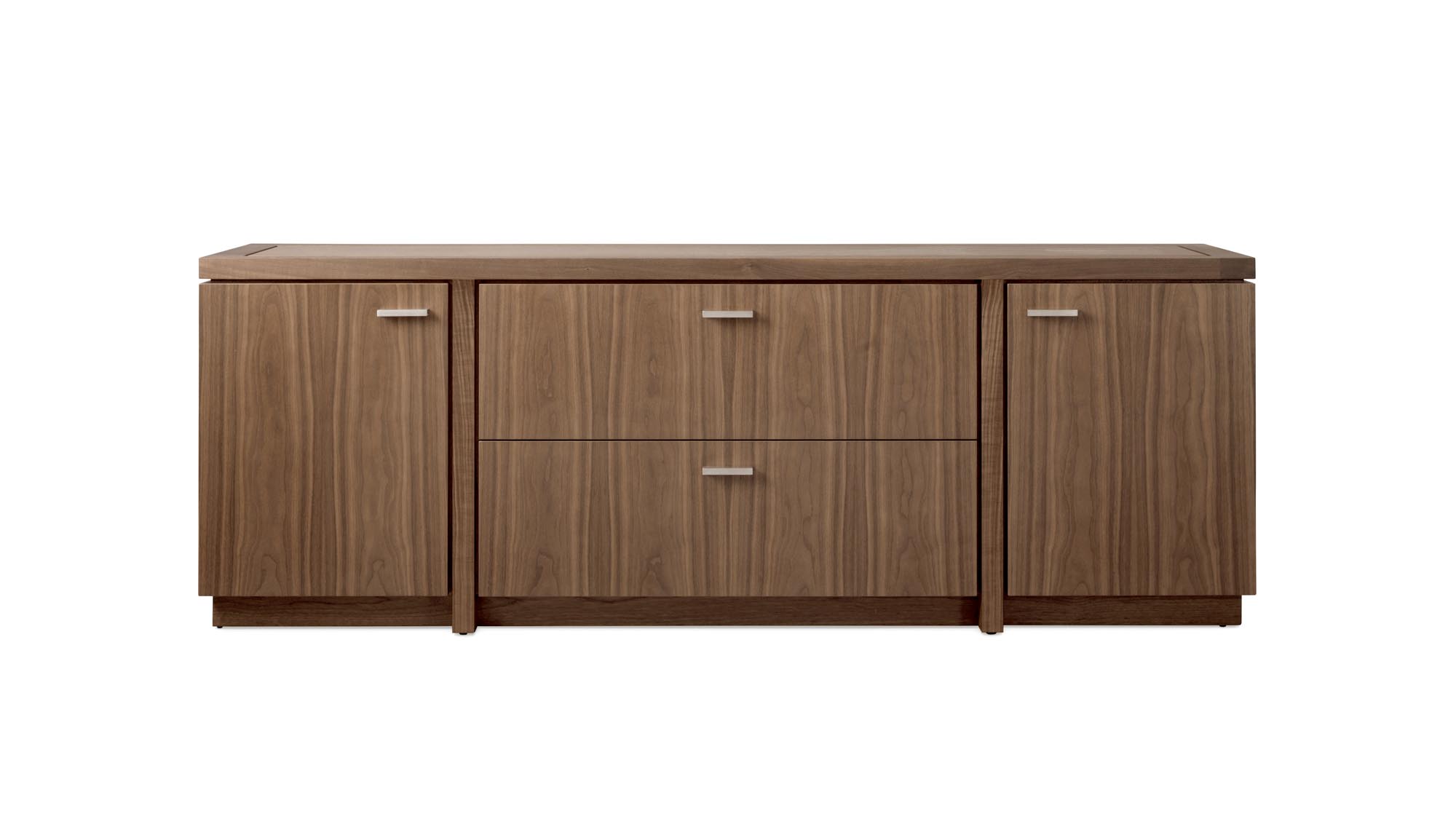 Shown in Medium Walnut with Dark Walnut base. Optional Satin Lacquer fronts with Polished Stainless Steel edge pulls - 72W x 21D x 30H