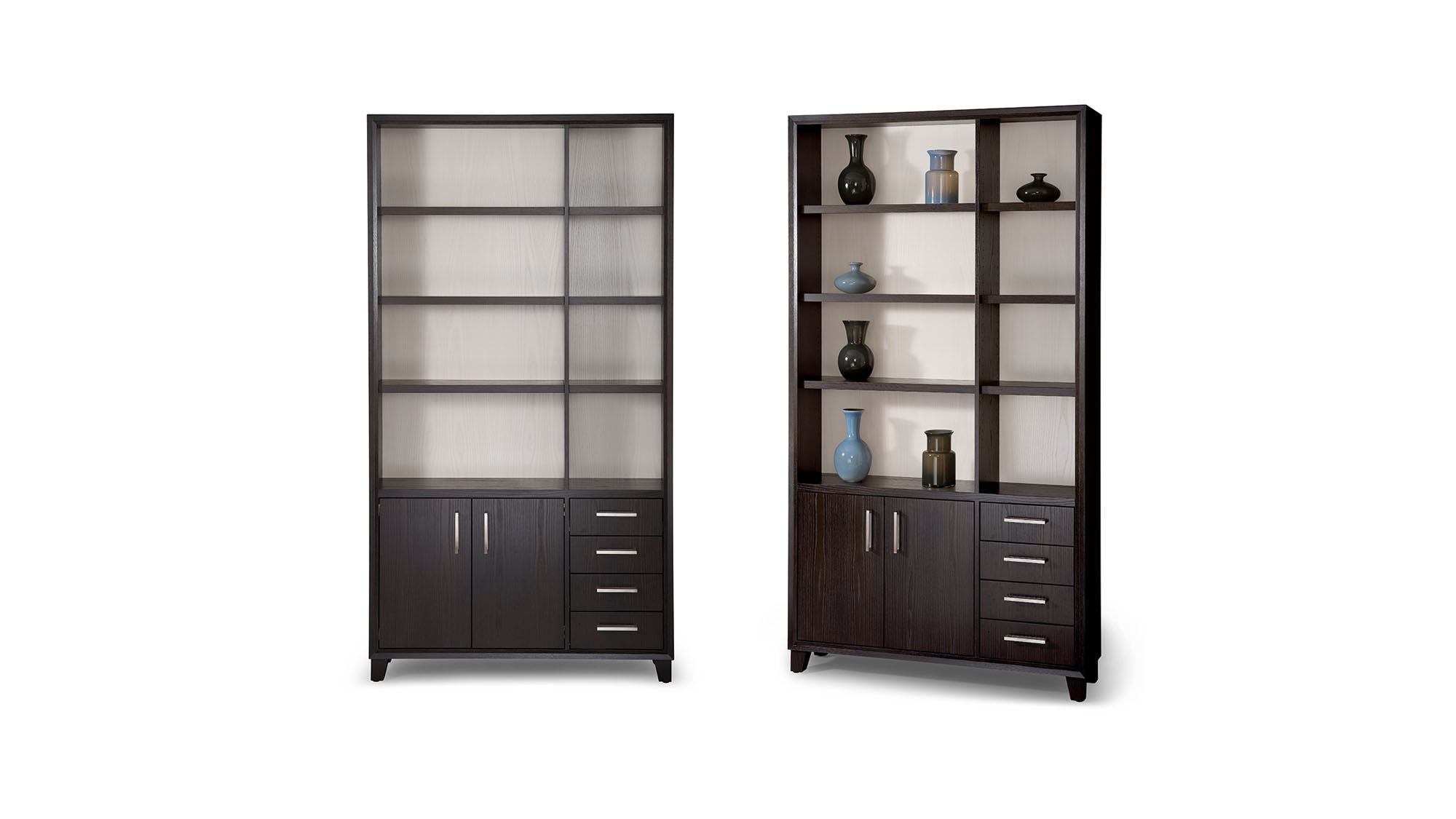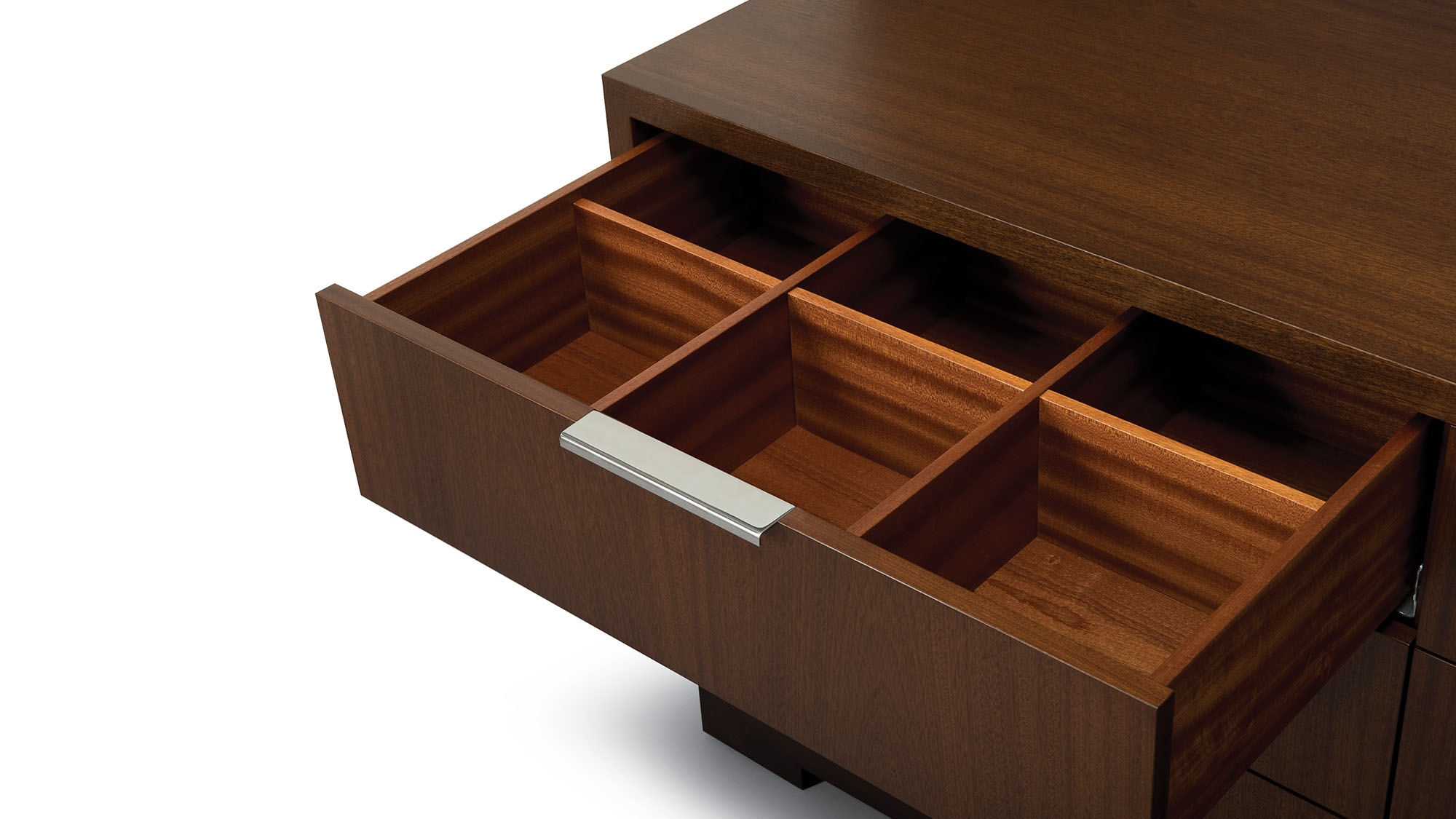 Shown in Medium Mahogany with Dark Walnut base, Polished Stainless Steel Edge Pulls and Optional Drawer Dividers