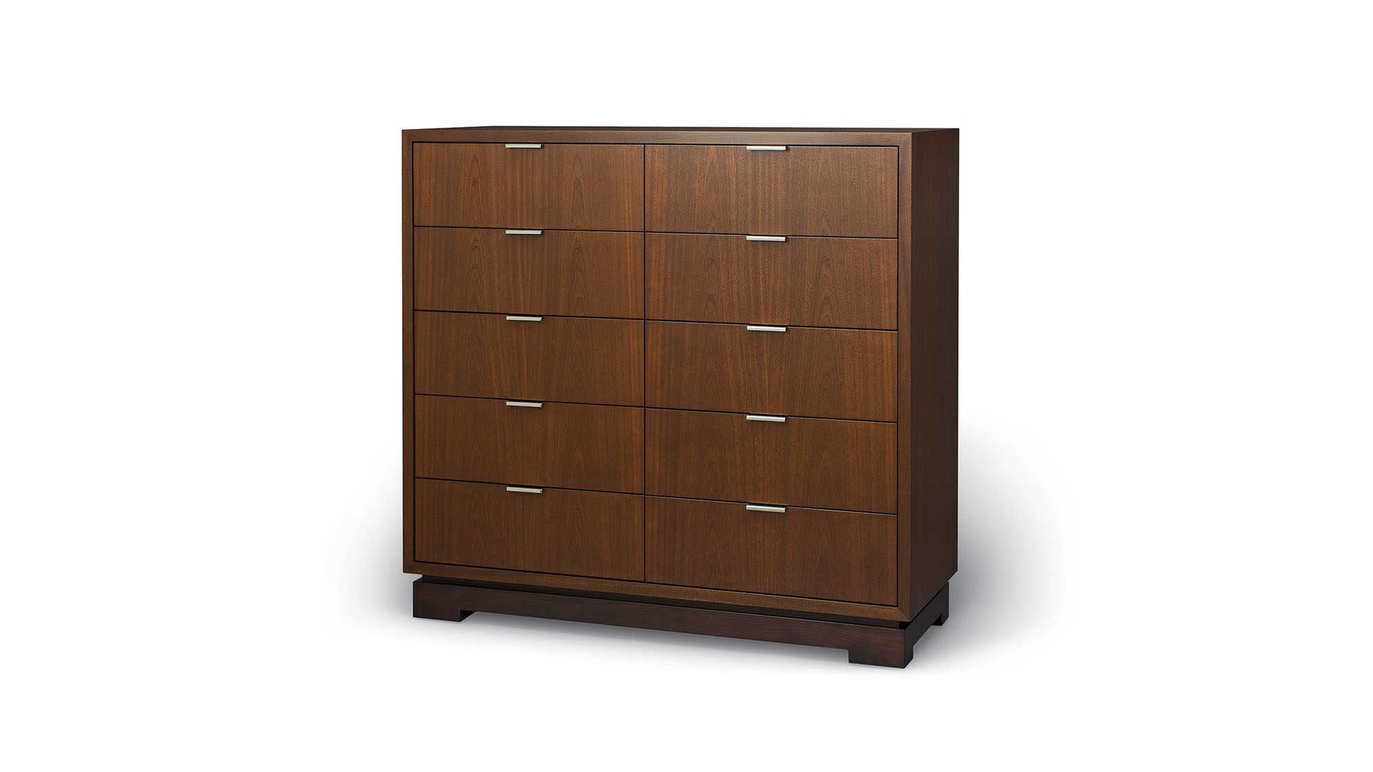 Custom 10 Drawer Version - Shown in Medium Mahogany with Dark Walnut base, Polished Stainless Steel Edge Pulls and Optional Drawer Dividers
