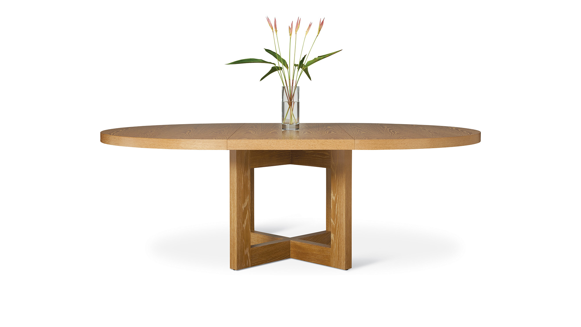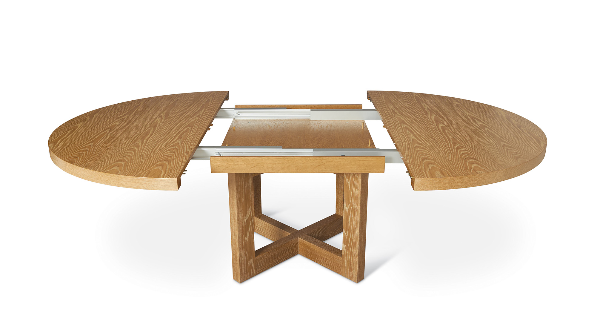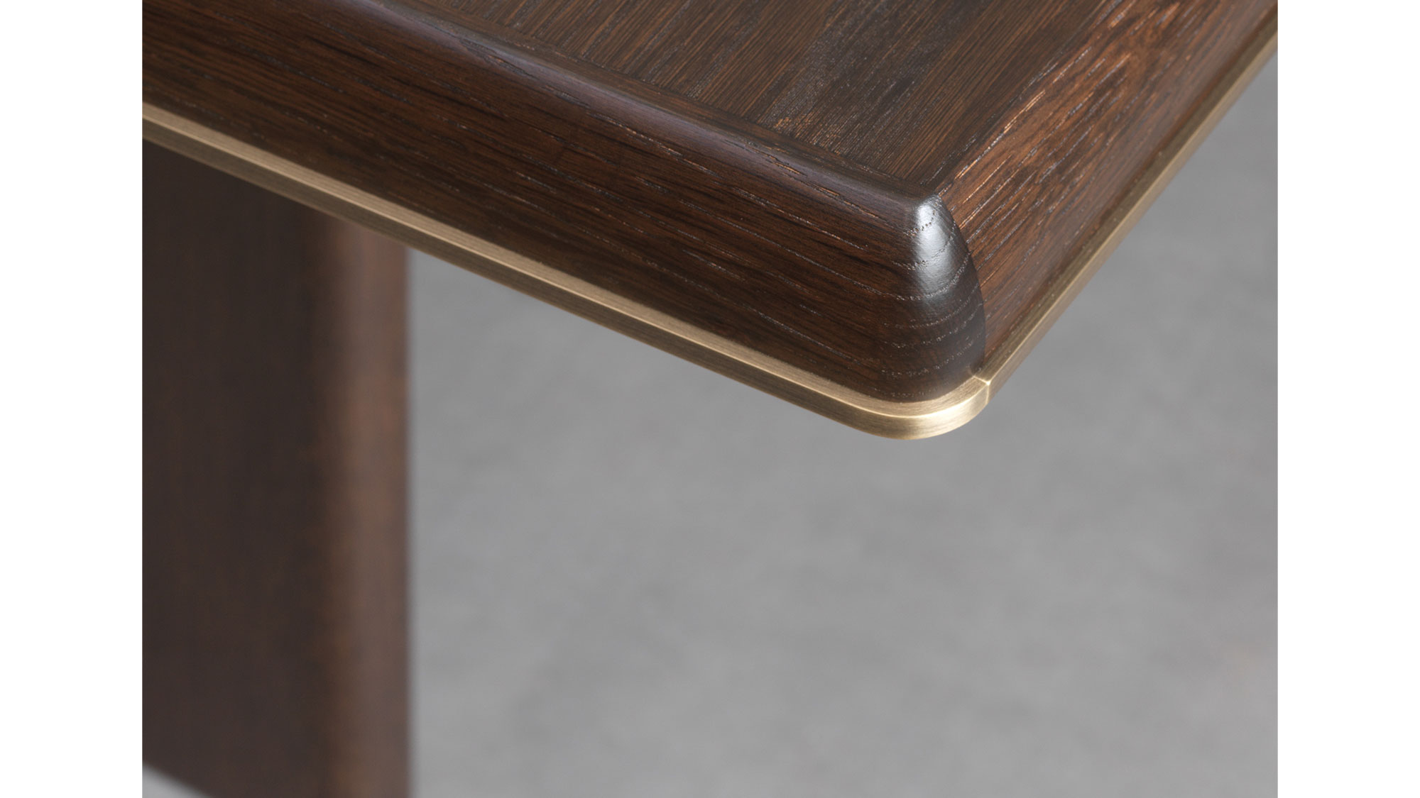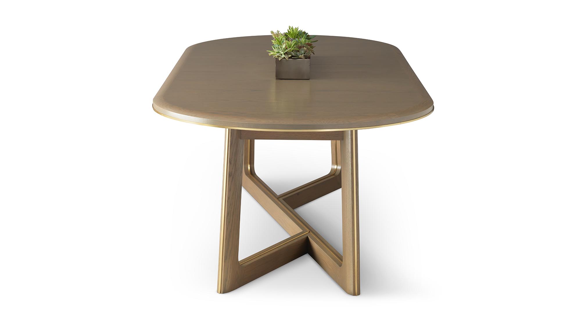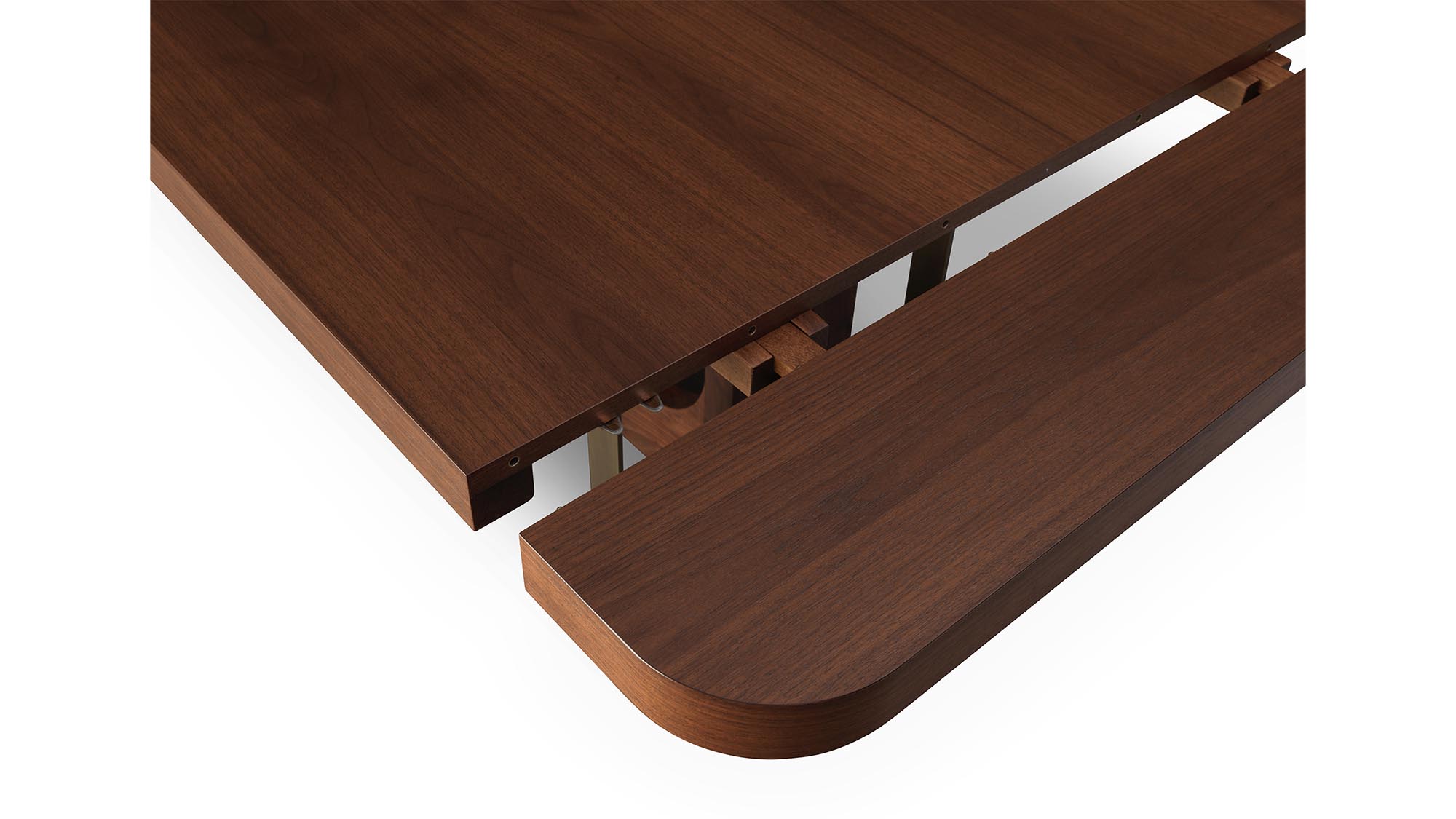 Extension version shown with self-storing pivoting leaves in in Bluff Oak and optional Satin Brass inlay - 84 W x 42 D x 29 1/4 H