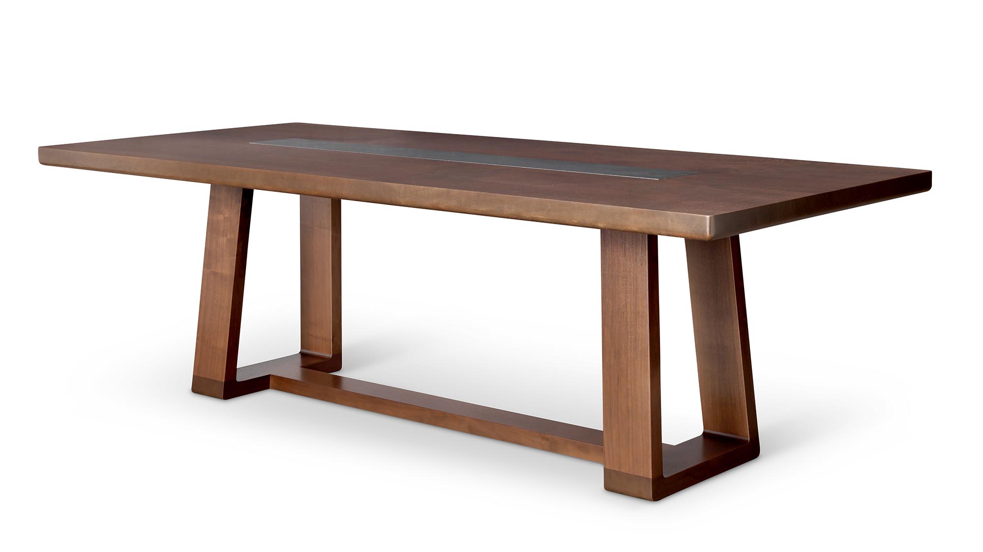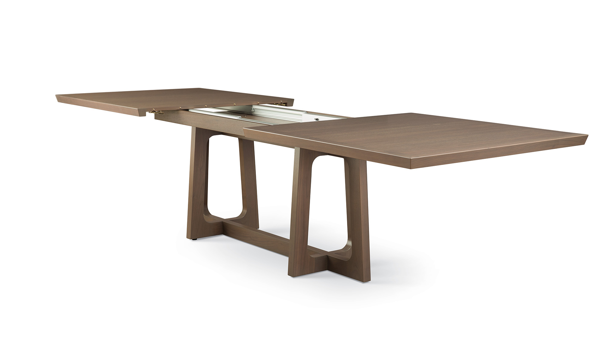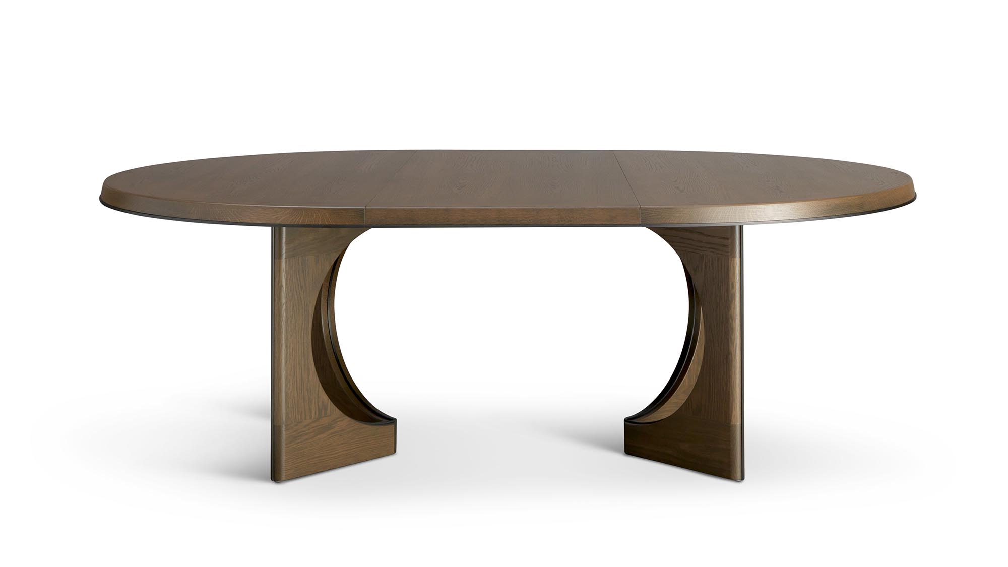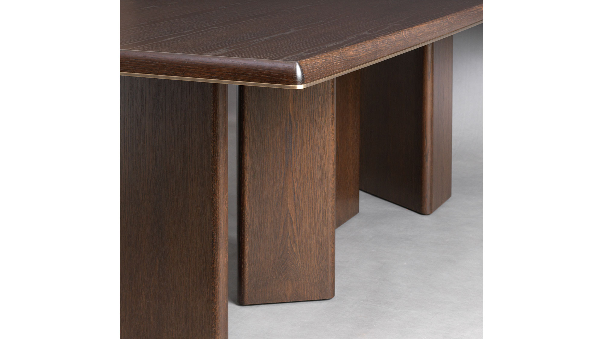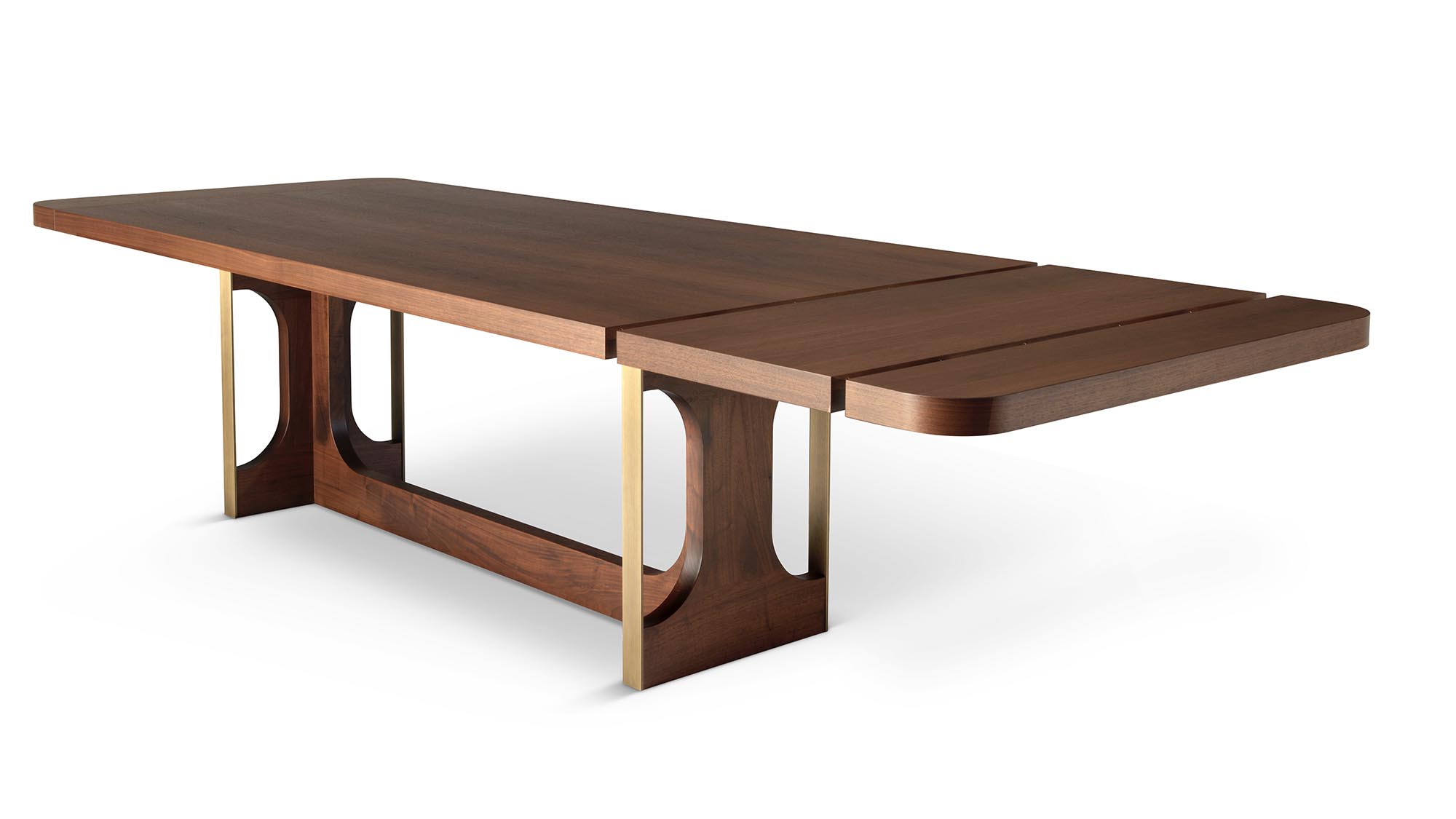 Extension version shown with self-storing pivoting leaves in in Bluff Oak and optional Satin Brass inlay - 84 W x 42 D x 29 1/4 H