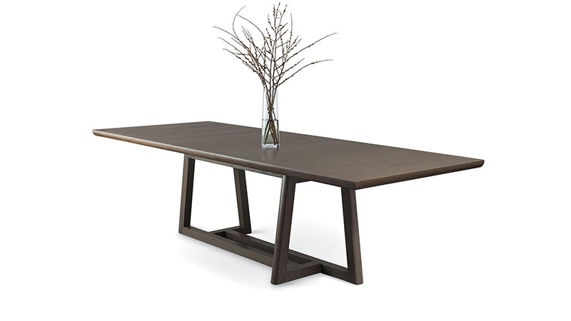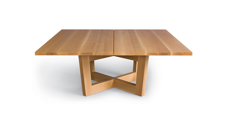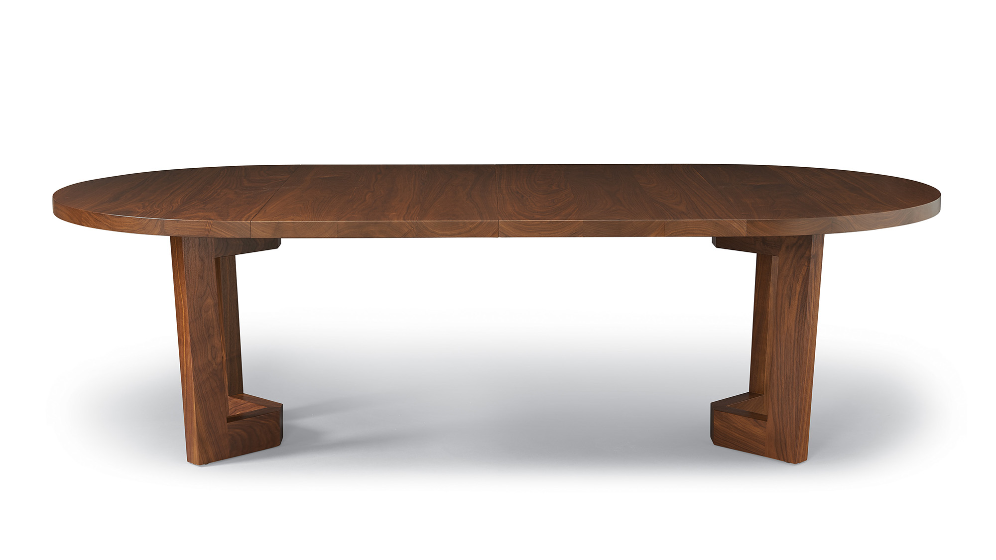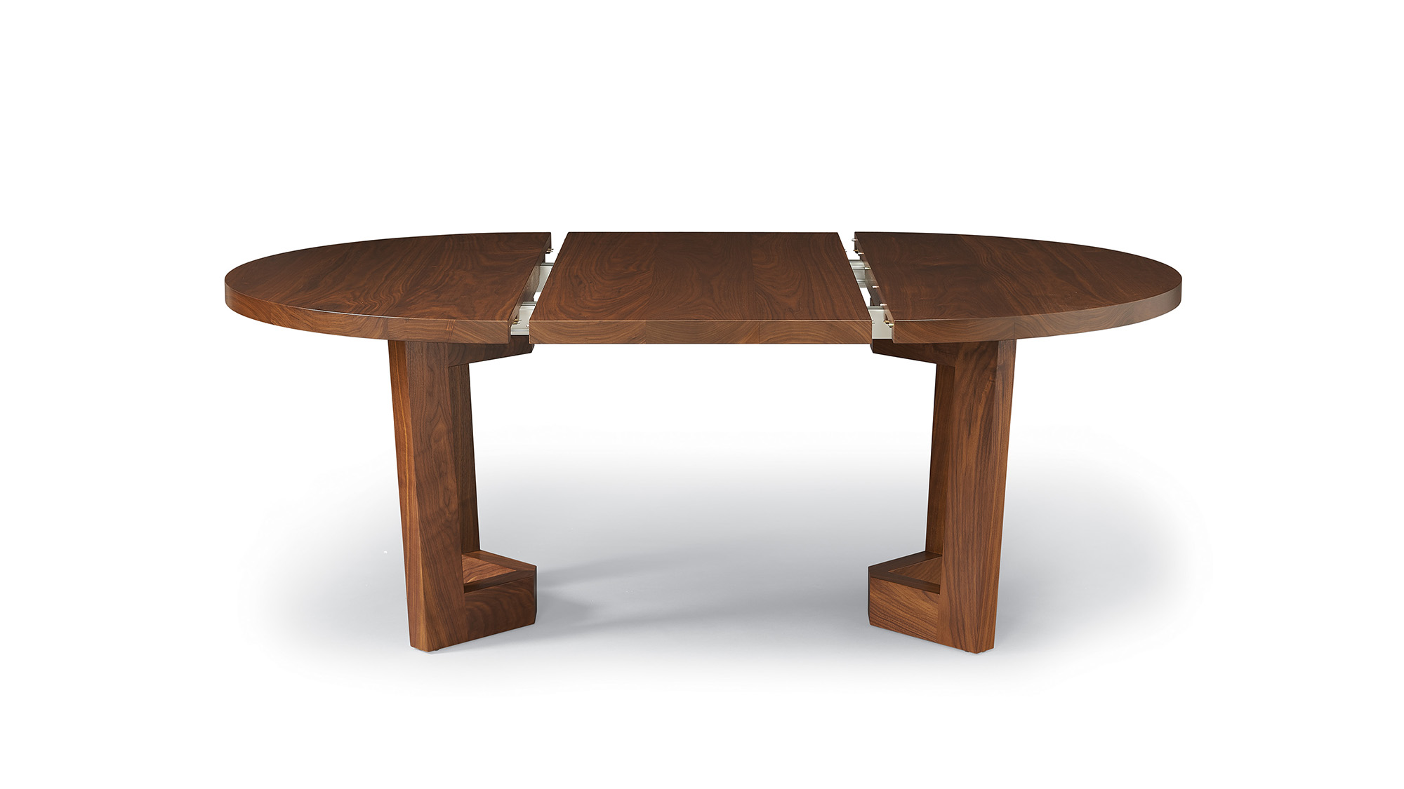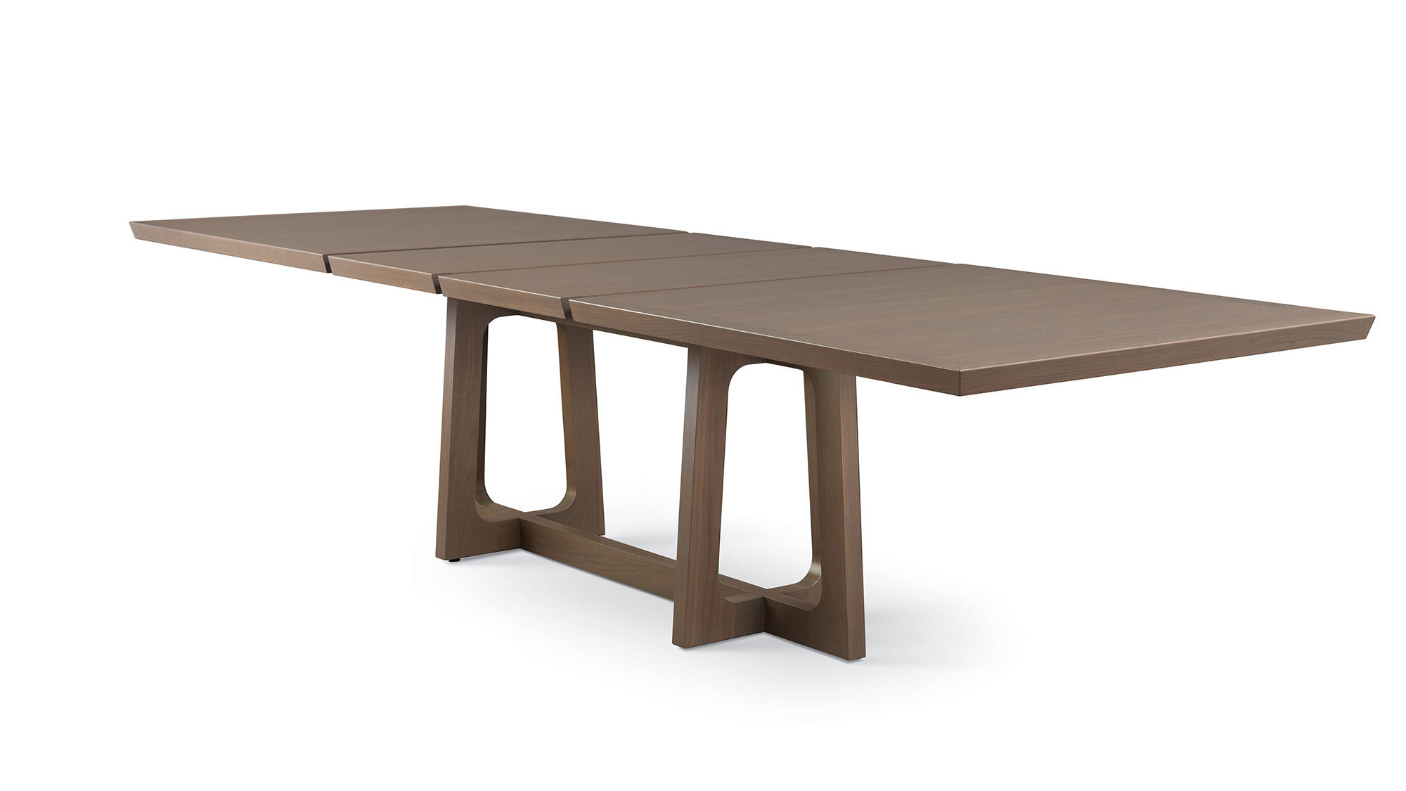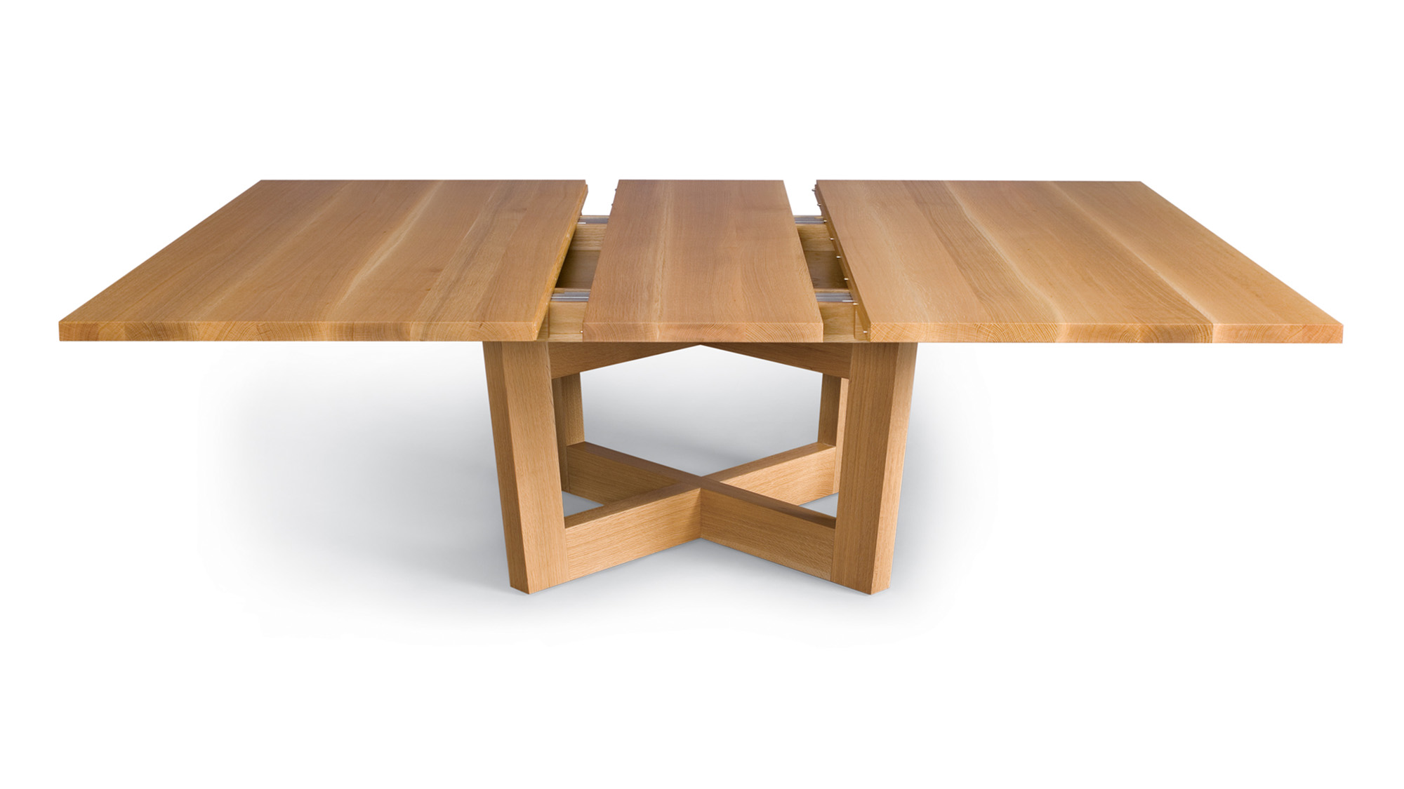 Extension version shown with self-storing pivoting leaves in in Bluff Oak and optional Satin Brass inlay - 84 W x 42 D x 29 1/4 H