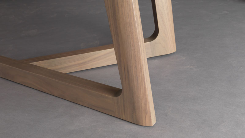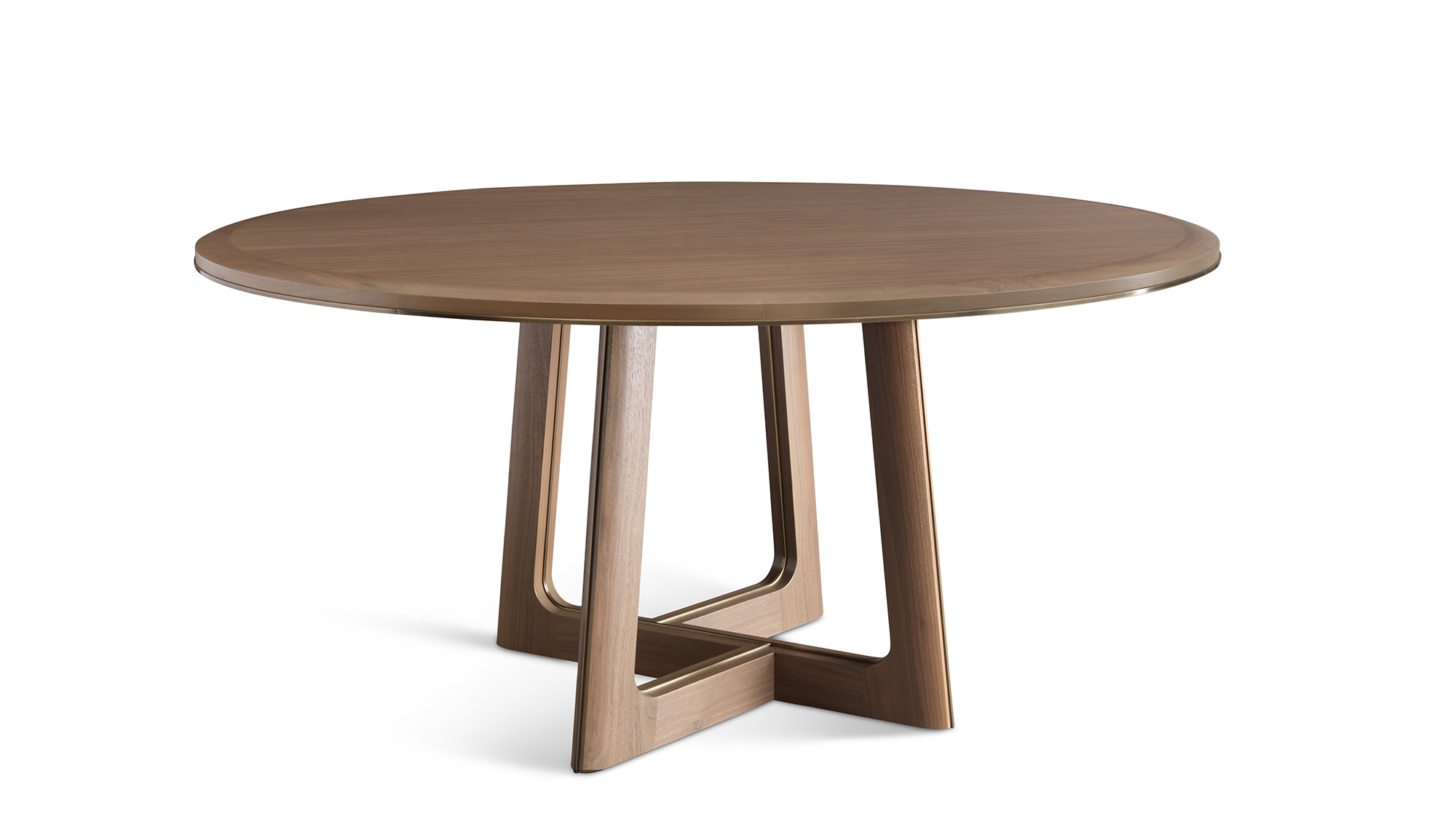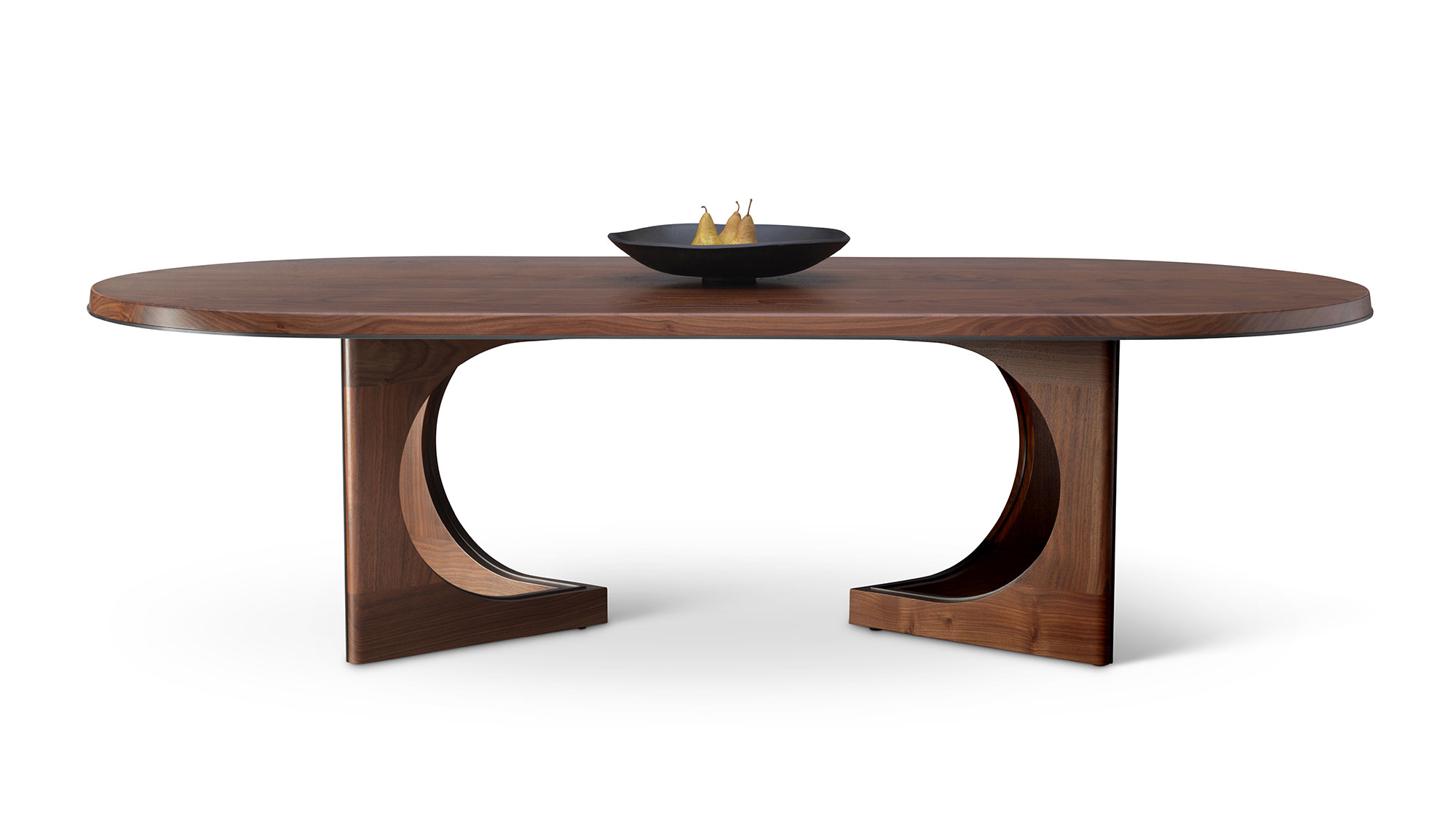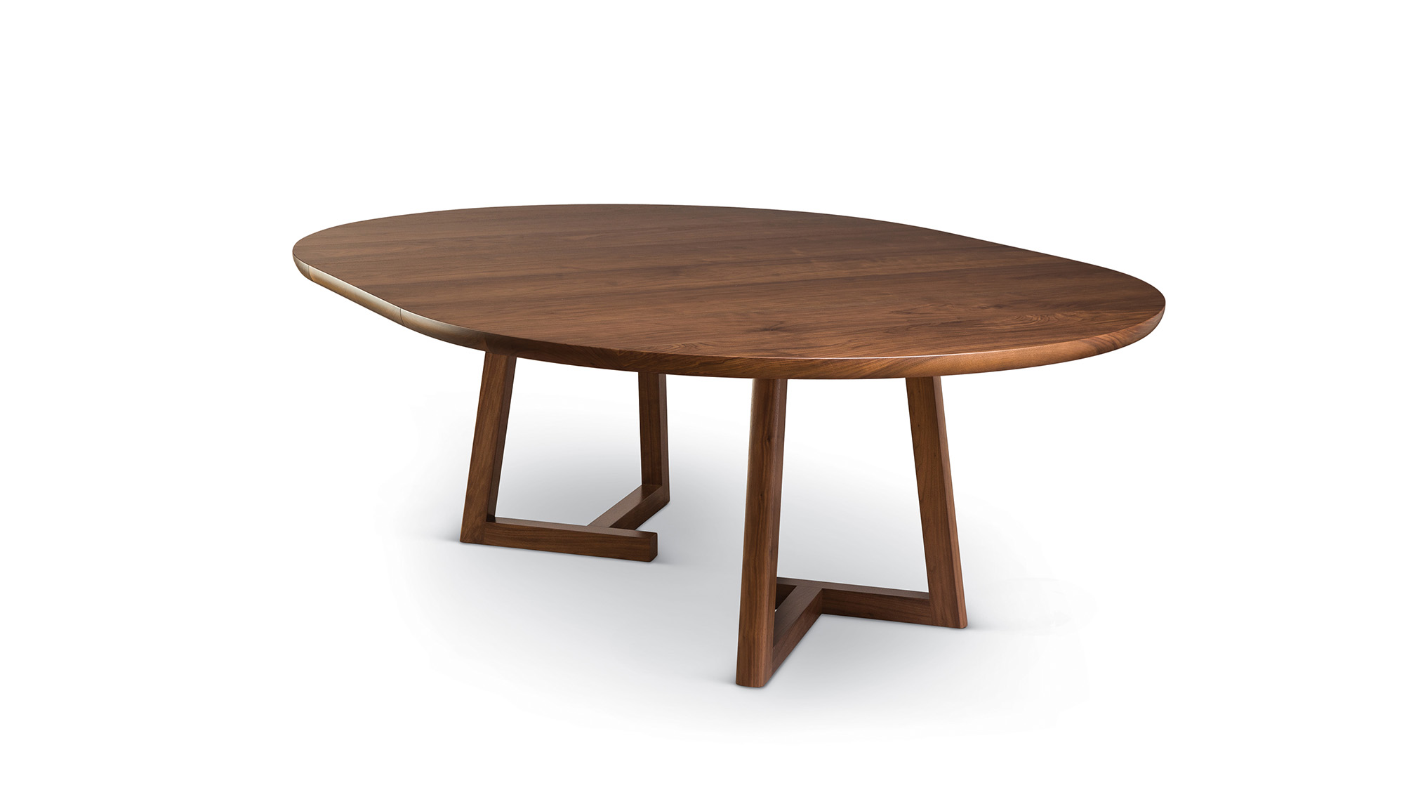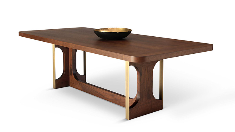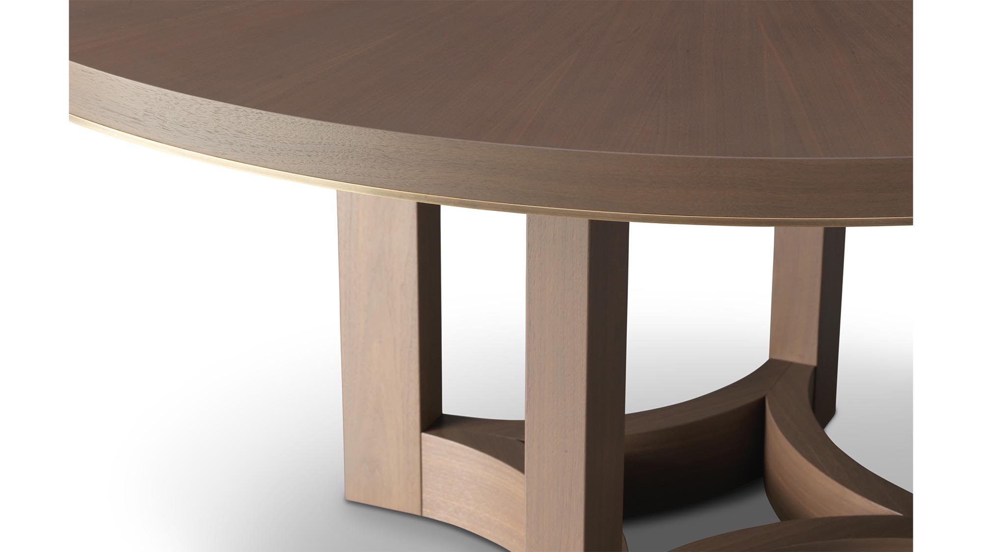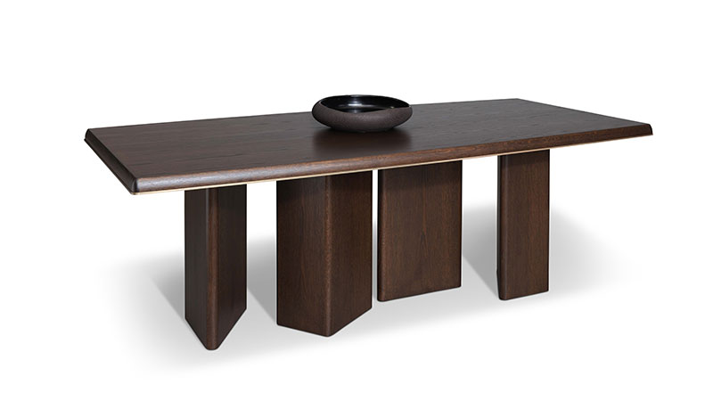 Extension version shown with self-storing pivoting leaves in in Bluff Oak and optional Satin Brass inlay - 84 W x 42 D x 29 1/4 H