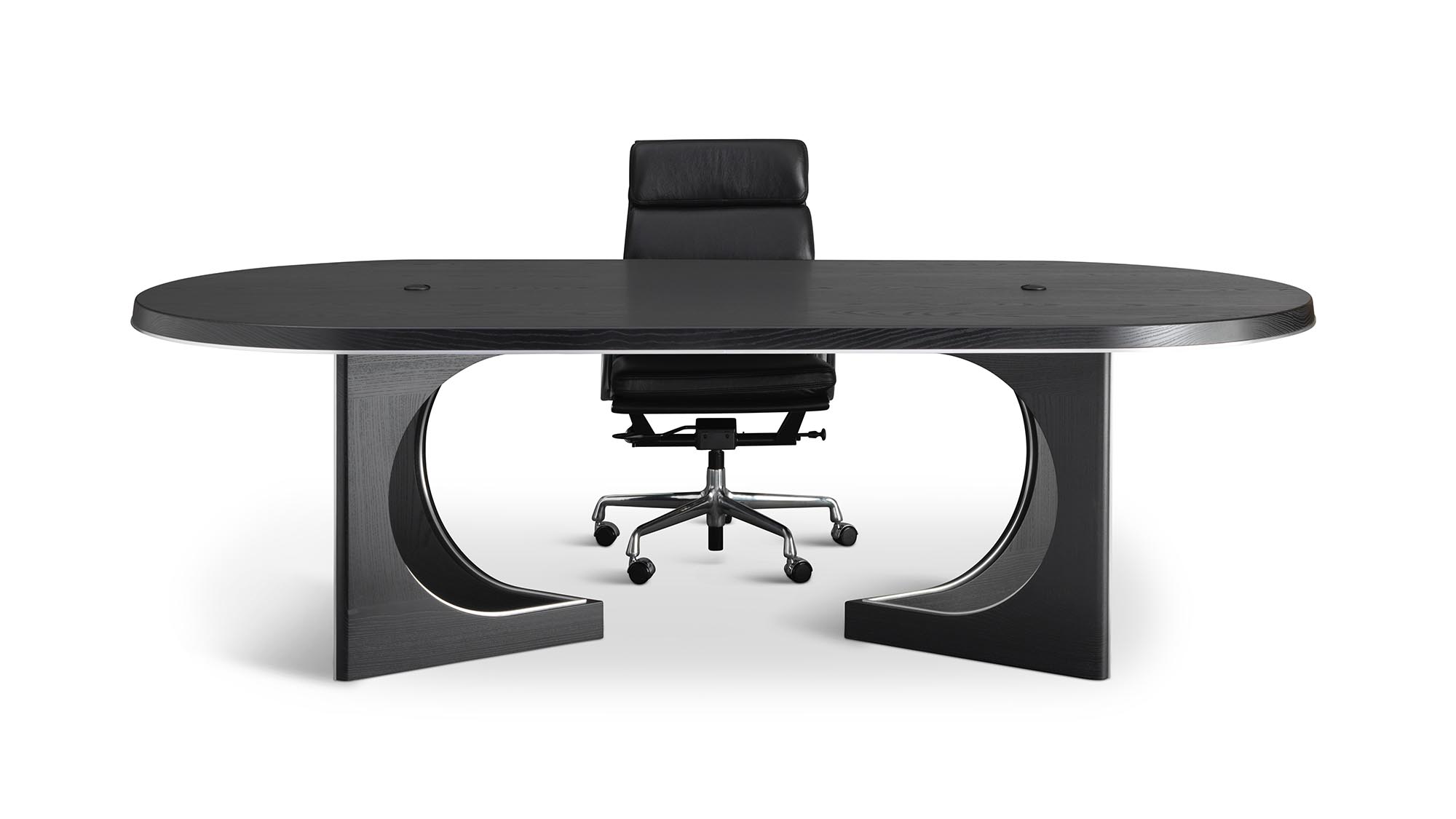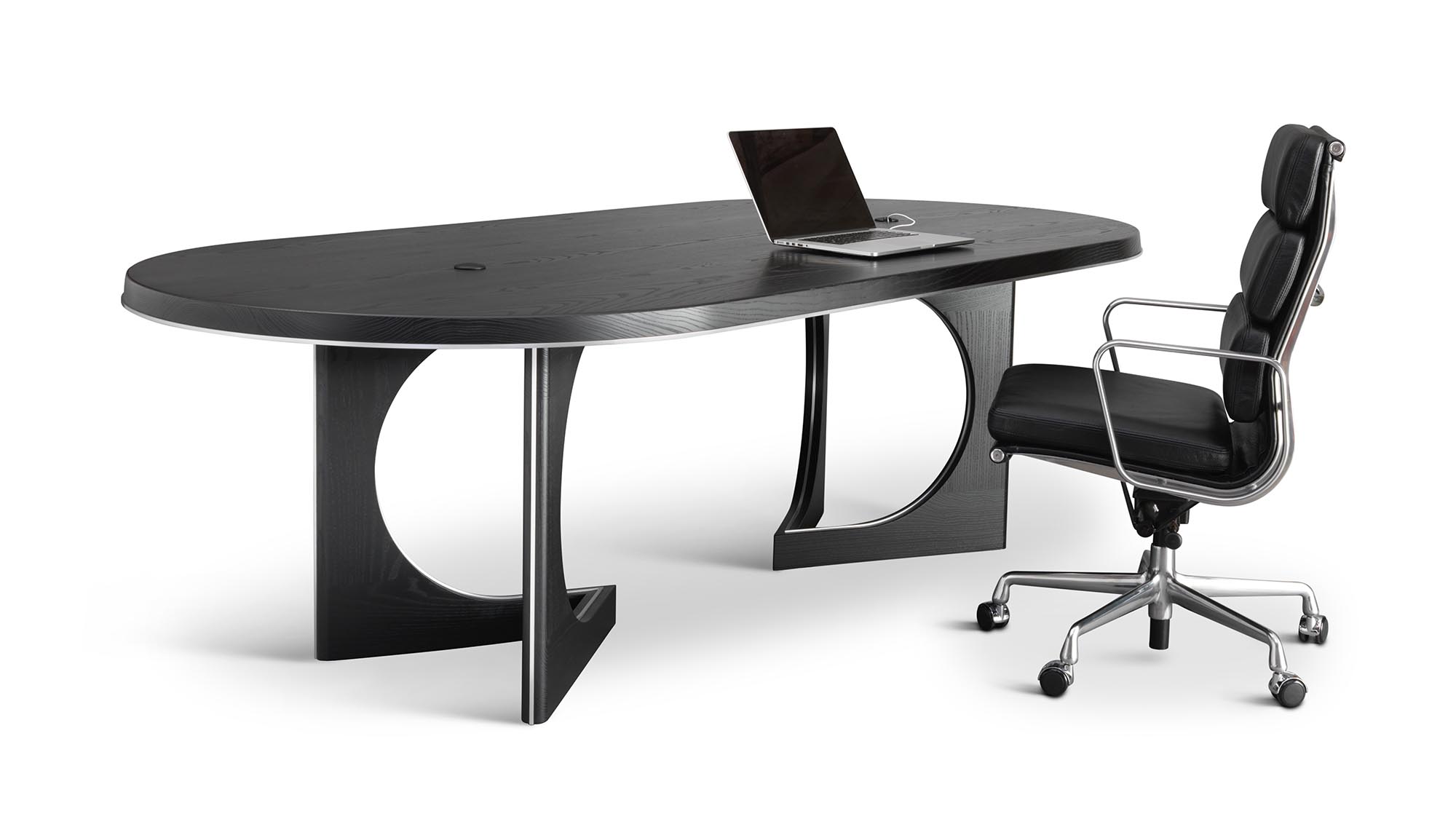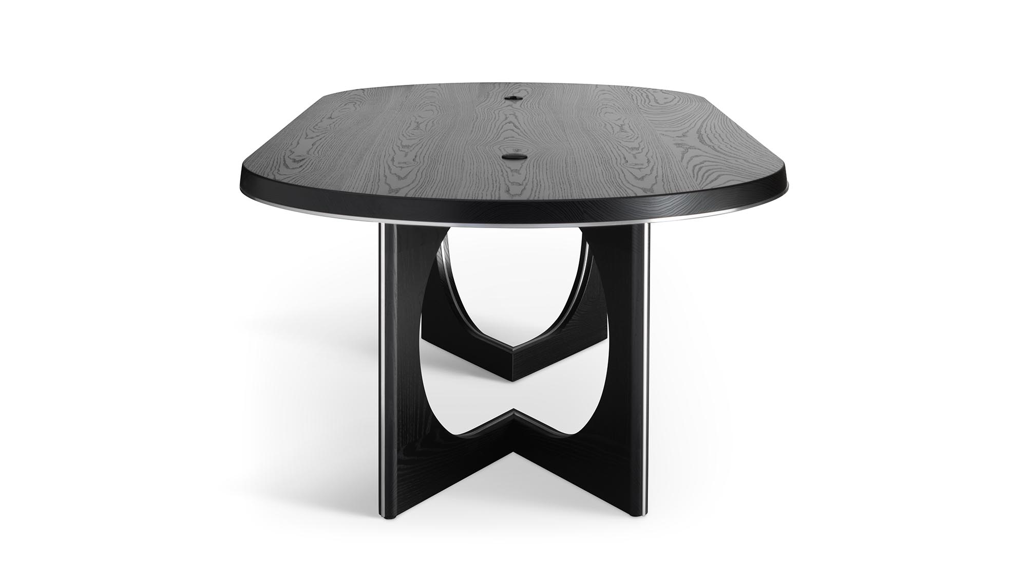 Shown in Ebonized Ash with Satin Aluminum inlay and optional wood grommets - 96W x 42D x 29H